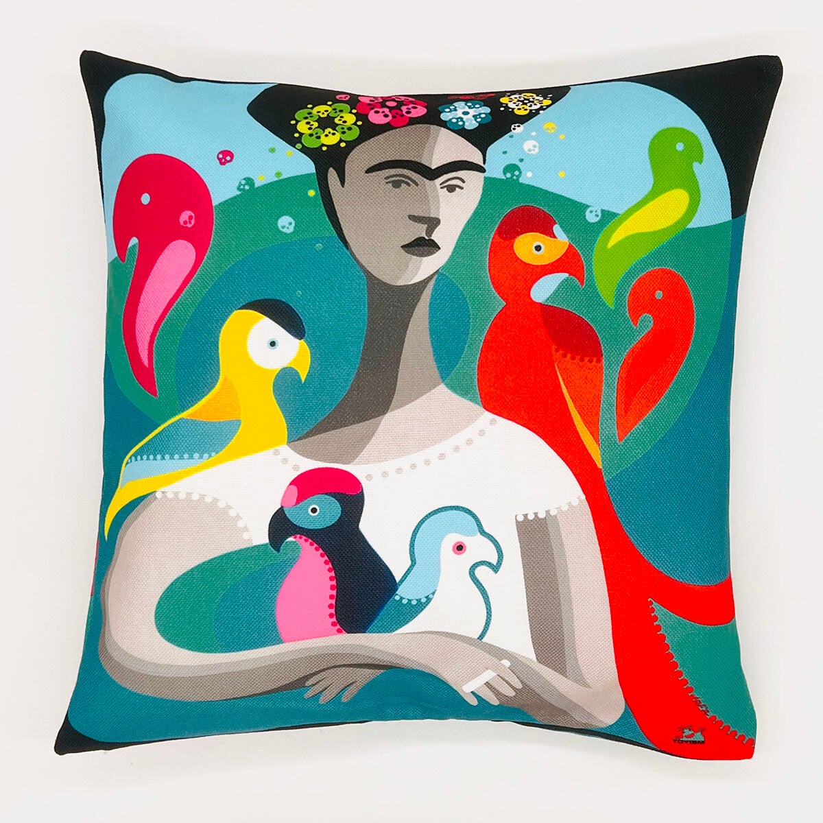 Deze bijzondere houding tegenover de dood wordt in dit schilderij, dat gebaseerd is op Frida Kahlo’s zelfportret “Me and my Parrots” (1941), afgebeeld met de kleurrijke doodshoofden/bloemblaadjes, omdat de dood een alom aanwezig thema is in haar werk, in verband met haar fragiele gezondheid.